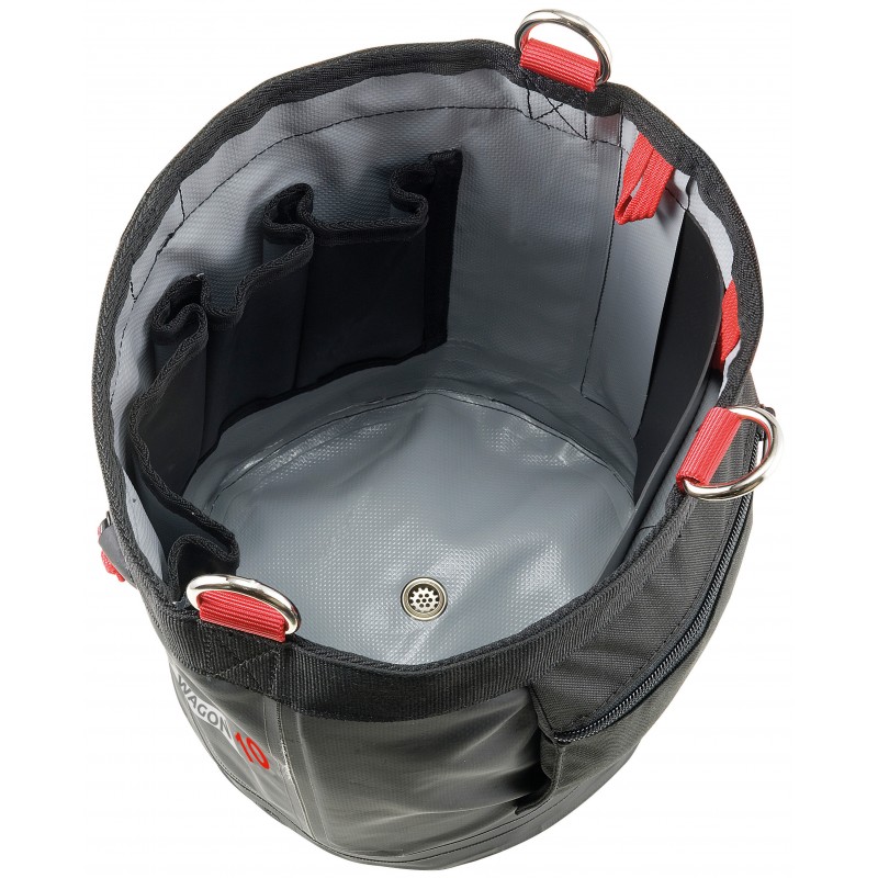 Cesto per l'alloggiamento degli attrezzi necessari durante i lavori in altezza. Fabbricato in robusto Tarpaulin PVC 500D termosaldato. Sviluppato per essere fissato all'imbracatura oppure per essere sospeso, grazie ai tre anelli metallici. Carico massimo: 50 kg. Struttura semi-rigida per garantire che il cesto rimanga aperto durante l'uso. Cappuccio di chiusura riponibile nell'apposita tasca. Ampie tasche interne. Asole portamateriali. Tasca porta-etichetta trasparente. Dimensioni: ø 23x27 cm. Peso: 570 g. 10 litri