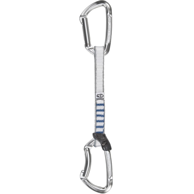 Fettuccia da 17 cm (res. 25 kN) in nylon e due moschettoni modello Lime (Resistenza asse maggiore: 23 kN, Resistenza asse minore: 8 kN, Resistenza leva aperta: 8 kN). Provvisto di fermamoschettone Fixit. Peso: 104 g