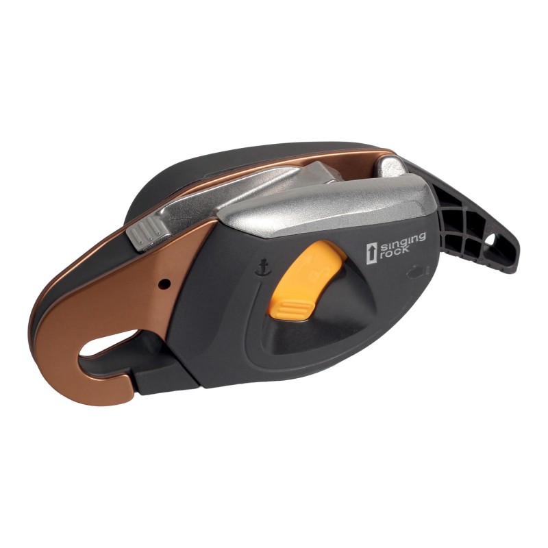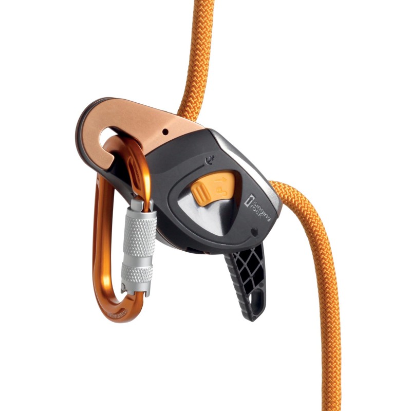 Discensore e assicuratore bloccante per corda singola compatto e leggero. Maniglia che permette di controllare la velocità di discesa. Su corda non caricata, tenendo premuto il centro dell'attrezzo è possibile disattivare il bloccaggio ed estrarre la corda dal dispositivo senza dover ruotare la leva, ciò consente di utilizzare il dispositivo, ad esempio, per assicurare un primo di cordata o per muoversi rapidamente su un tetto piano. Dispositivo di apertura per impedire di perdere l'attrezzo durante l'inserimento della corda. Camma con magnete per l'inserimento agevolato della corda. Calata di carico pesante fino a 200 kg. Per corde da 9,3 a 12 mm di diametro. Non provvisto della funzione antipanico. Peso: 410 g. EN 12841-C: carico massimo 200 kg, con corda statica 10-12 mm EN 341-2A: carico massimo 150 kg (lunghezza massima di discesa 100 m), con corda statica da 11 mm EN 15151-1 tipo 6, con corda statica 9,3 – 11 mm CE 1019