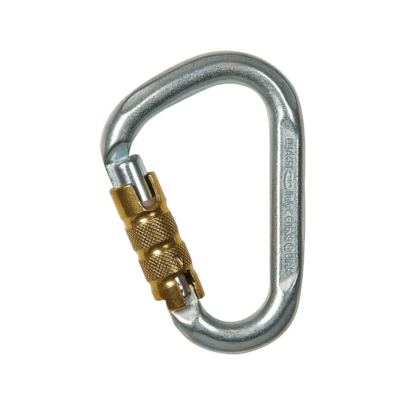 Forma pera asimmetrico, alto carico. Resistenza asse maggiore: 40 kN. Resistenza asse minore: 15 kN. Resistenza leva aperta: 15 kN. Peso: 250 g. Corpo e leva in acciaio zincato. Key lock. Ghiera a tripla sicurezzaDestinatario :
